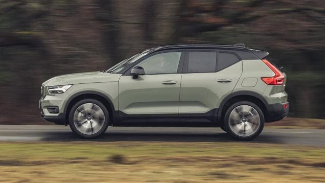 Volvo XC40 phiên bản chạy điện không quá khác biệt khi nhìn ngang thân xe, 2 tông màu nóc sơn đen mà màu ngoại thất vẫn rất đặc trưng giúp xe trở nên thể thao hơn.